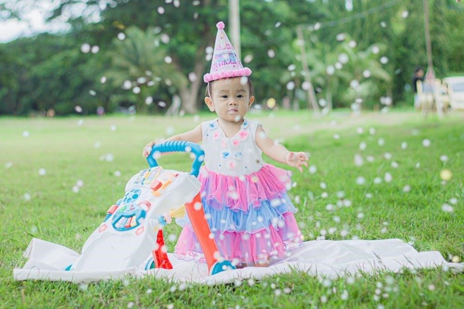 Finally, install the toy bar, often a simple snap-in process, and confirm its secure attachment. Double-check all connections to guarantee a robust and safe structure. The manual emphasizes following each step meticulously. Remember, a properly assembled walker provides optimal support and confidence for your little one’s first steps. Prioritize safety and stability throughout the assembly process;